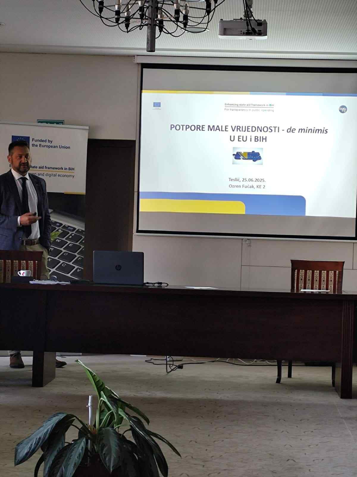 Teslić, BIH; 25. lipnja 2025. – U okviru Projekta “EU for State Aid in BiH”, a na temelju iskazanog interesa provedbenih tijela u Bosni i Hercegovini, održano je predavanje na temu „Potpore male vrijednosti – de minimis u EU i BiH”.