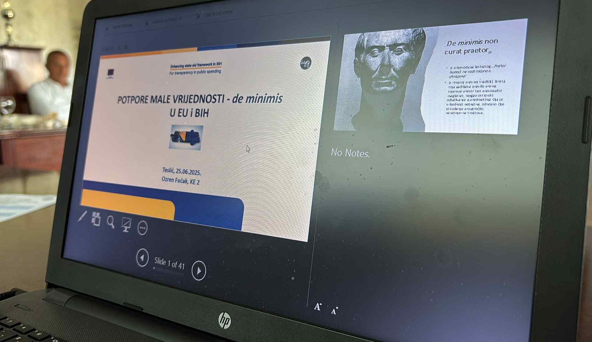 Predavanje je održao Ozren Fućak, ključni ekspert na projektu, koji je sudionicima iz relevantnih institucija predstavio detaljan pregled važećeg normativnog i regulatornog okvira za dodjelu potpora male vrijednosti (de minimis). Fokus je bio na pravilima koja vrijede u državama članicama Europske unije te na obvezama koje u tom pogledu imaju zemlje kandidatkinje za članstvo, uključujući Bosnu i Hercegovinu.